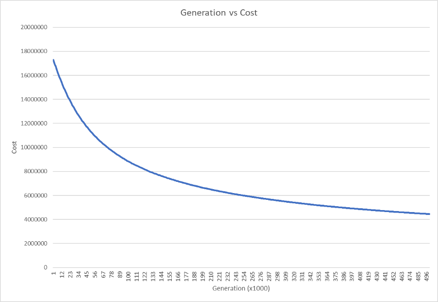 This graph is comparing the costs of the first 500,000 generations of the 256x256 test. The curve shows that as the accuracy of the population's best candidate image increases, the changes caused by breeding and mutation become less pronounced.
